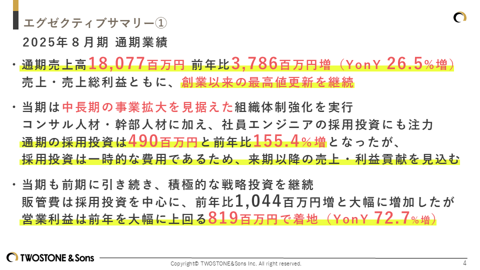 まず「幹部採用と人材の育成」に関して、第4四半期も積極的な採用投資を行いました。その結果、営業・コンサル人材を30名、正社員エンジニアを53名採用し、中長期の収益拡大に向けた成長基盤を構築できたと考えています。これらの人材を用いて、2026年8月期以降のグループ全体の成長スピードを加速させる原動力としてまいります。