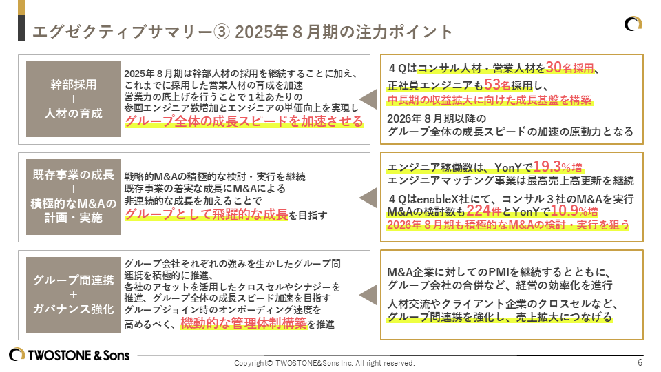 2025年8月期は、「幹部採用と人材の育成」「既存事業の成長と積極的なM&Aの計画・実施」「グループ間連携とガバナンス強化」の3点を注力ポイントとして掲げました。