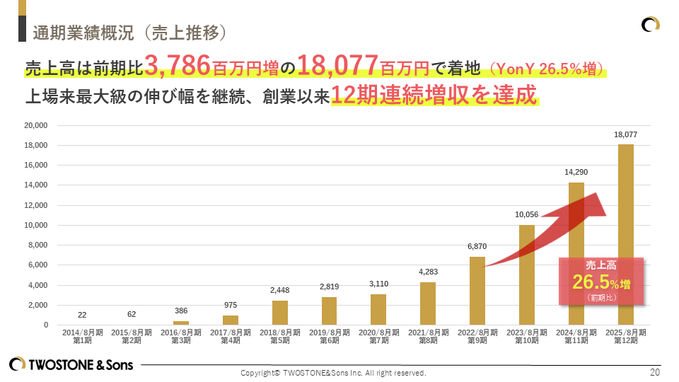 株式会社TWOSTONE&Sons(所在地:東京都渋谷区、代表取締役CEO:河端保志、代表取締役COO:高原克弥、証券コード:7352、以下 当社)は、本日2025年10月15日、2025年8月期 通期決算を発表しました。