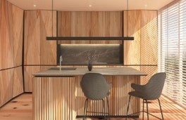 丸平木材は、日本の林業における課題“山の荒廃”を訴え、資源の循環を促すためにはテロワールを形成したブランドを作り上げることが必要だと考える。 今回は、宮城の分水嶺が育んだ南三陸の木材、大地の力強さが生んだ雄勝の石、海の街・三陸沿岸ならでは美しいリアスの風景、これらをミックスしたキッチンを展示。