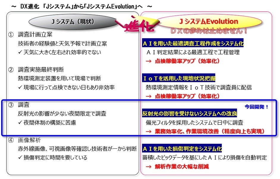 また、現行の「Jシステム」の課題に対し、今回の偏光フィルタ技術のほかAIやIoTを導入・活用することにより、赤外線調査による構造物点検は飛躍的に改善されると考えております。今後も「Jシステム」を進化させた「JシステムEvolution」の実現に向け、更なる効率化に取り組んでまいります。
