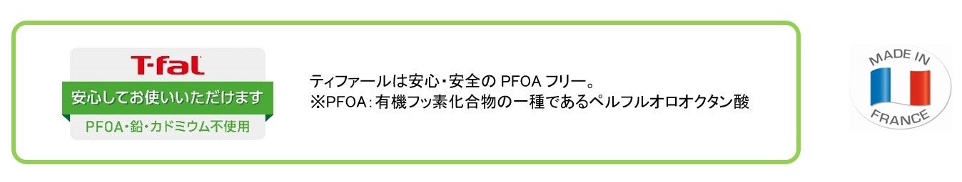 もちろん、ティファールとしてのフライパン・鍋の優れた機能性も兼ね備えています。中面(なかめん)はガス火専用で最高ランクのチタン・インテンスコーティングを施し、こびりつきにくさが長持ちします。また、予熱完了を教えてくれる「お知らせマーク」が付いているため、ベストなタイミングで調理をスタートでき、味も焼き目も思い通りに仕上がります。軽くて扱いやすいアルミニウムを採用した本体は、熱伝導に優れているので、フライパンや鍋全体にムラなく均一に火が通ることでどんな料理もおいしく作ることができます。いずれもガス火専用の製品で、数量限定販売となります。