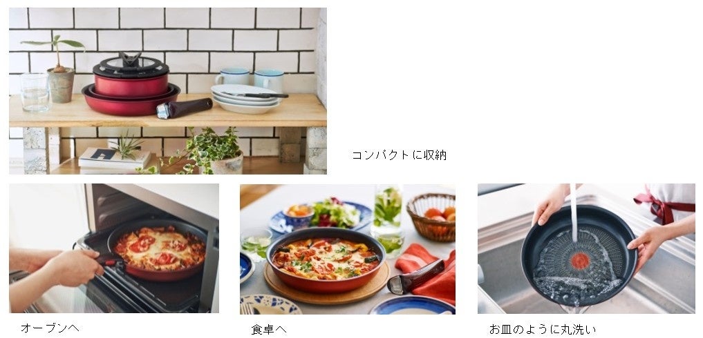 取っ手がとれるので、重ねてコンパクトに収納できるほか、オーブン調理や、調理後にそのままテーブルに出すことも可能。お皿のように丸洗いができるため、お手入れも簡単です。