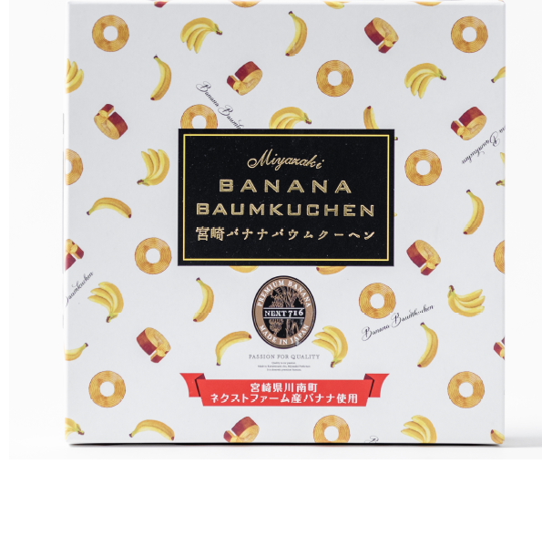国産・無農薬の宮崎県産バナナ「NEXT716」を使用したバウムクーヘンです。バナナの味と香りが濃い特徴のバームクーヘンは絶品です。