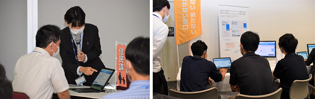 当日は、来場者が住民役となり、「書かない窓口」(かんたん窓口システム)から転入手続きとこれに伴う福祉関連の申請を体験したほか、来場者自身のスマートフォン等を活用したオンライン申請(スマート申請システム)体験を行いました。