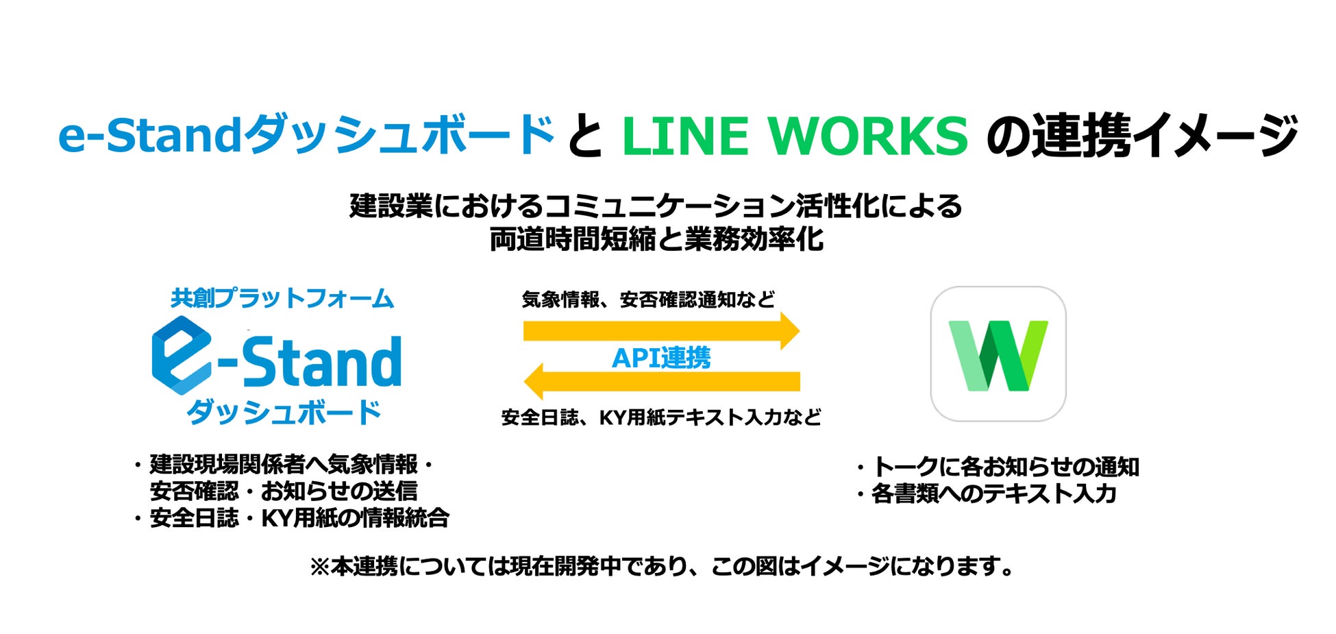 さらに今後、飛島建設では、「LINE WORKS」をコミュニケーションツールとして利用するだけでなく、建設業界の多くのソフトウェアを一括管理できる「e-Standダッシュボード」と連携することで、現場がある場所の台風、大雨などの気象情報や熱中症など警報の通知、現場書類を「LINE WORKS」から「e-Standダッシュボード」へ送信するなど、建設現場でのさらなる利便性向上を目指します。