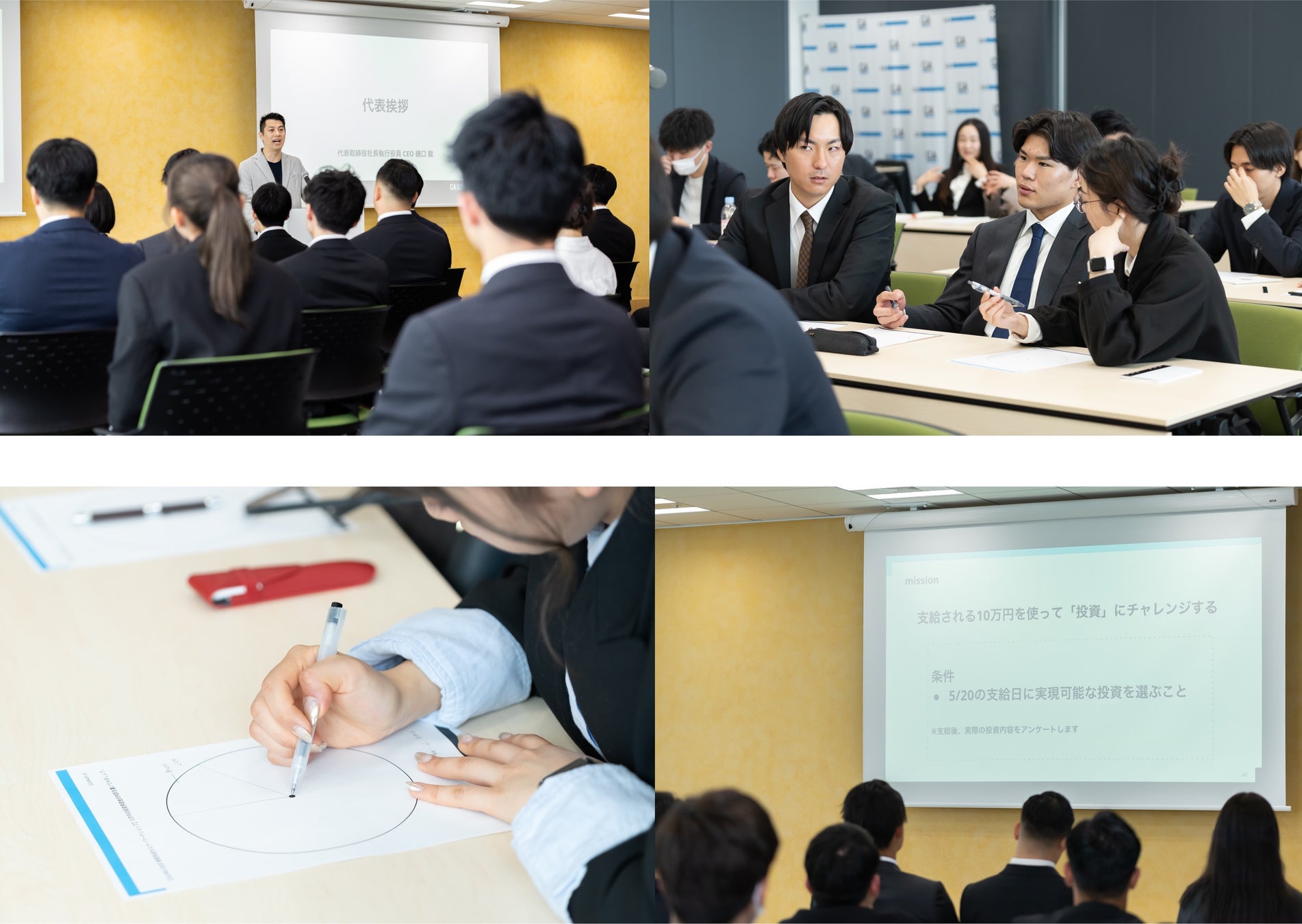 その後、司会からサプライズで「新卒の新入社員一人あたり10万円を投資用資金として支給」することを発表しました。驚喜する新入社員に対して、「投資用資金」をどのように使いたいか考えるワークショップを実施。セミナーで学んだ知識を生かし10万円の使い方を真剣に考える姿から、「自分の未来に投資する」新入社員の意気込みが窺えました。