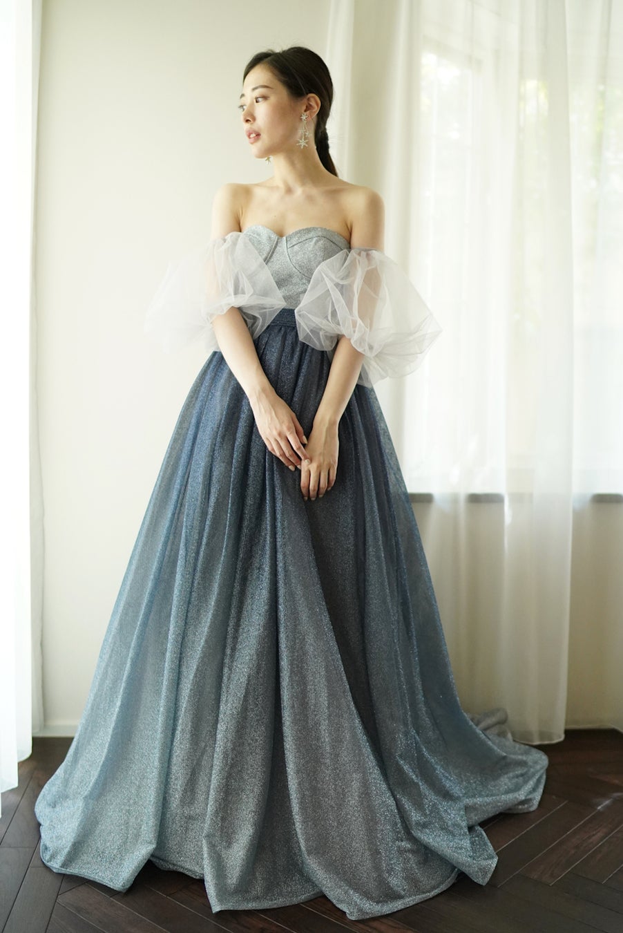フェミニンな色合いと、煌めくビーディングが美しい「天の川を流れる流れ星」をイメージしたドレス。長方形に並べられたビーディングが、甘さの中に程よいアクセントを生み出している。透明感のあるエアリーなチュールと、花嫁の動きに合わせて煌めくビーディングが自然光に映え、幻想的な印象与えてくれる。ピンクとブルーグレーの2色展開。