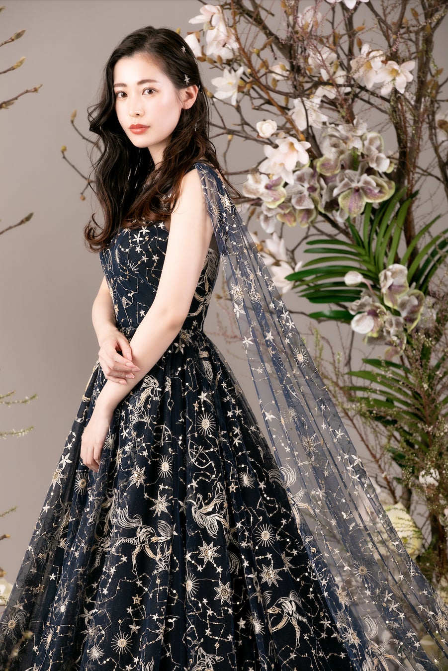 デザイナーがこだわり抜いた海外から独自に取り寄せた希少な生地に、夜空に輝く星座をモチーフにした繊細な刺繍を施した、甘さと上品さをあわせもつドレス。また、両肩から流れるようなショルダートレーンは、バックスタイルをより美しく彩ります。動くたびに光を受けてきらめくドレスは、特別な日をより一層輝かせてくれます。トレンドの星モチーフのアクセサリーを合わせるとより幻想的な雰囲気に。世界でも希少な生地を使用しているため、このコレクションが最初で最後、今しか着れない貴重なドレスです。