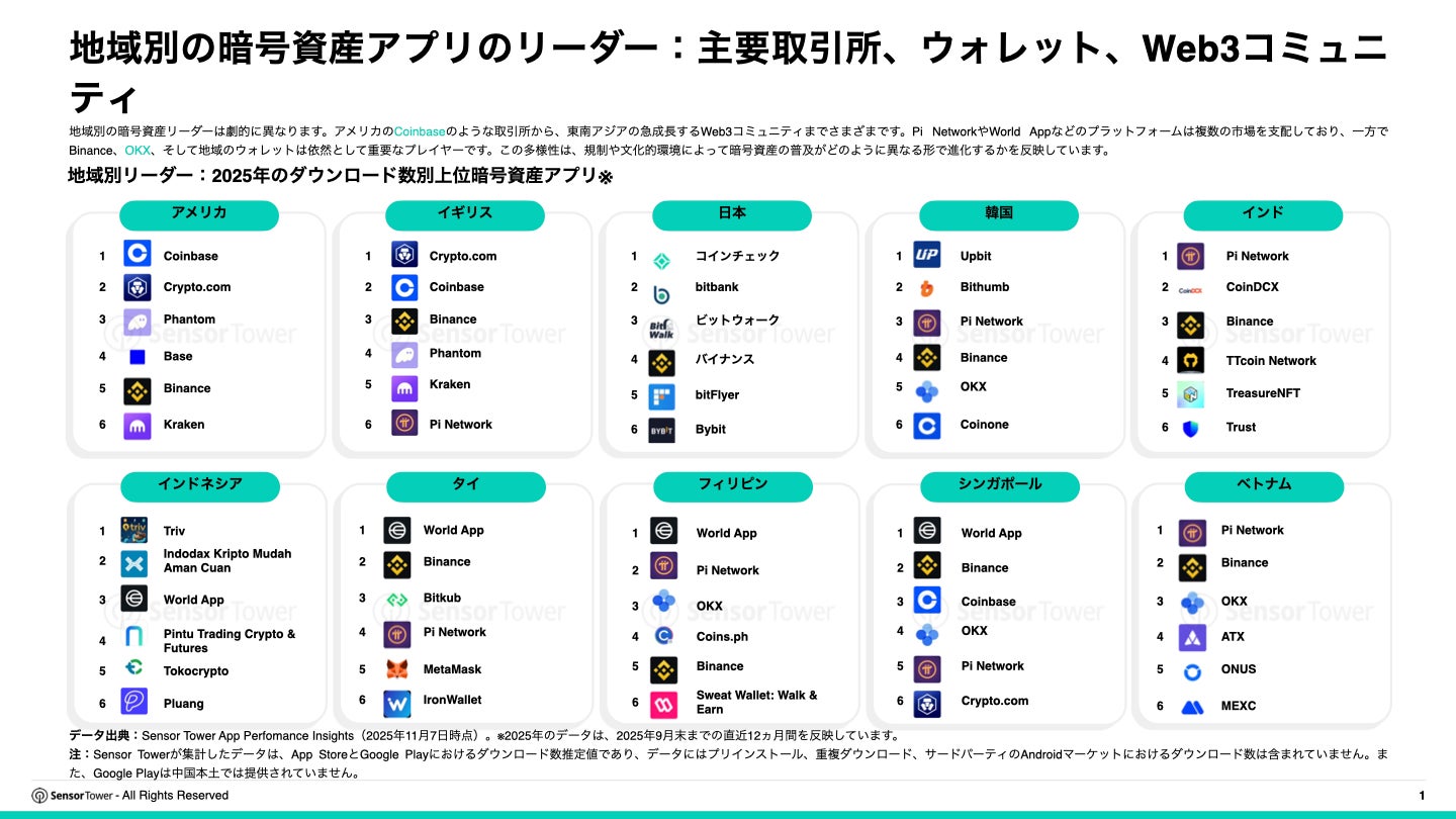 アプリダウンロード数6年連続「国内No.1*」の暗号資産取引サービス「Coincheck」を運営するコインチェック株式会社(本社:東京都渋谷区、代表取締役:蓮尾 聡、以下、当社)は、Sensor Tower調査『2025年投資・資産管理アプリ市場と広告トレンド』レポート(以下、本レポート)における「地域別の暗号資産アプリのリーダー」日本カテゴリで1位を獲得したことをお知らせいたします。