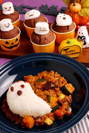 カボチャやナスが入った短時間で仕上がるドライカレーには、ごはんのおばけが登場!