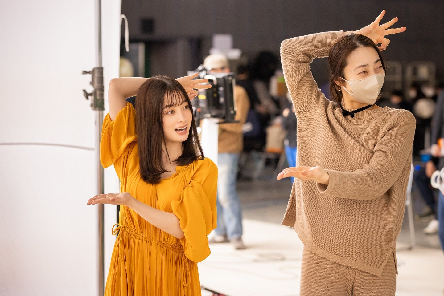 今回アレンジを加えたダンスは、2021年のテレビCM「ブックライブダンス」篇と同じ振付師さんによる考案と指導です。新しくアレンジが加わった、耳をペコリとするような動きや、太陽をイメージした手の動きなど入念にチェックして撮影に挑む環奈さんでしたが、ダンスシーンの撮影では監督から「いいですね!」と太鼓判を押されるものの環奈さんは「自分でも確認したい」と全力で取り組んでくださいました。