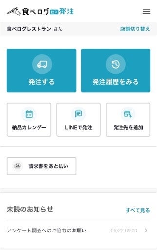 「食べログ仕入」は、飲食店向けの発注業務効率化サービス(※)です。飲食店はスマートフォンなどからログインして発注先を登録するだけで、発注書の手書き・管理の手間やFAX送信の費用などをかけることなく、簡単に発注ができます。