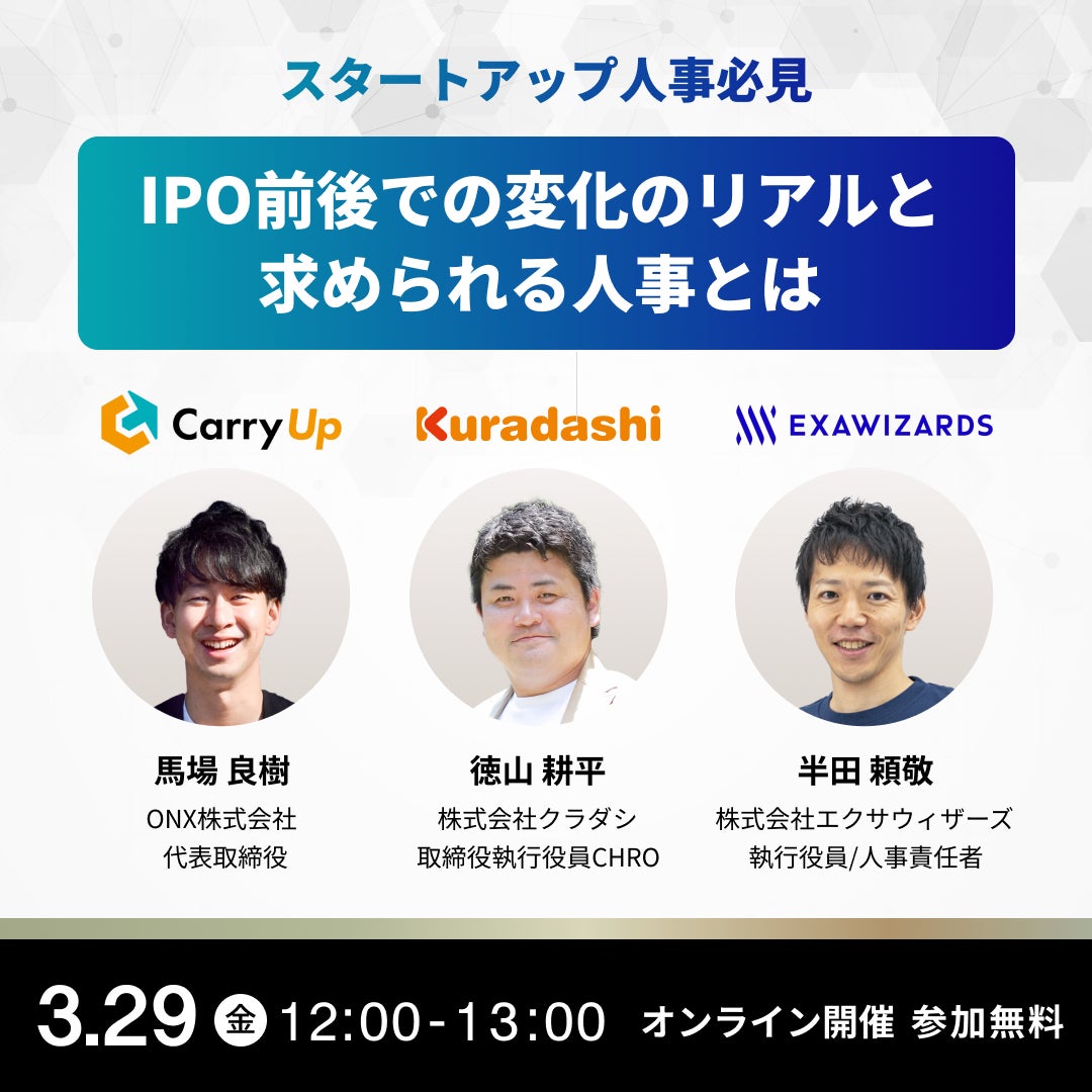 ユナイテッド株式会社(本社:東京都渋谷区、代表取締役社長 兼 執行役員:早川 与規、証券コード:2497、以下「ユナイテッド」)の連結子会社であるONX株式会社(本社:東京都渋谷区、代表取締役:馬場 良樹、以下「ONX」)は、2024年3月29日(金)に株式会社エクサウィザーズ執行役員 人事責任者 半田頼敬氏および株式会社クラダシ取締役執行役員CHRO徳山耕平氏をお迎えし、無料のオンラインセミナー「IPO前後での変化のリアルと求められる人事とは」を開催いたします。