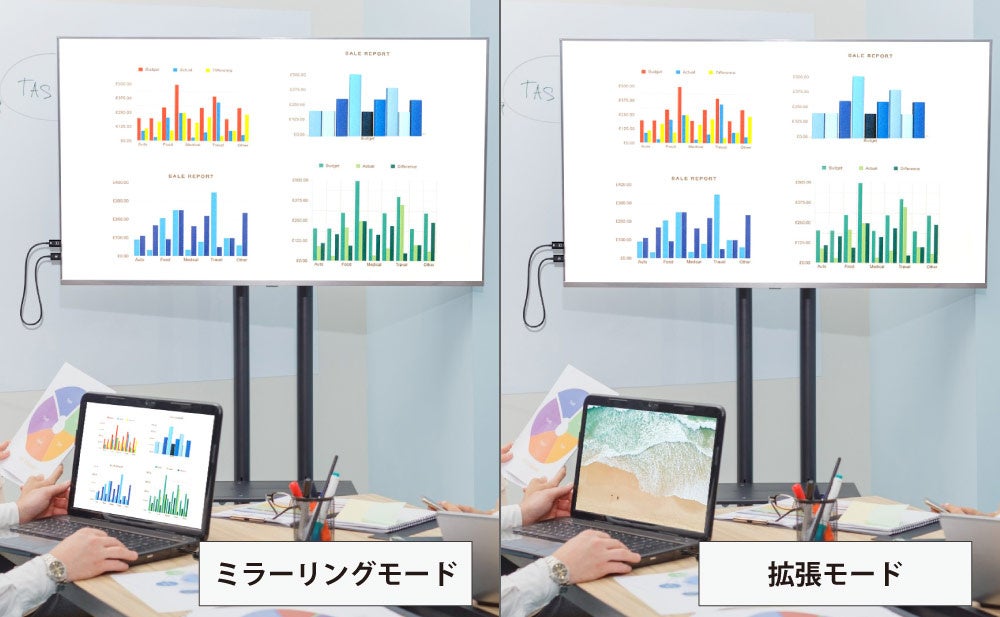 ミラーリングでは全て同じ画面が表示されるため、大画面で映像やゲームを楽しめます。また、拡張モードでは異なる画面が表示されるため、並行作業や複数タブの使用に役立ちます。