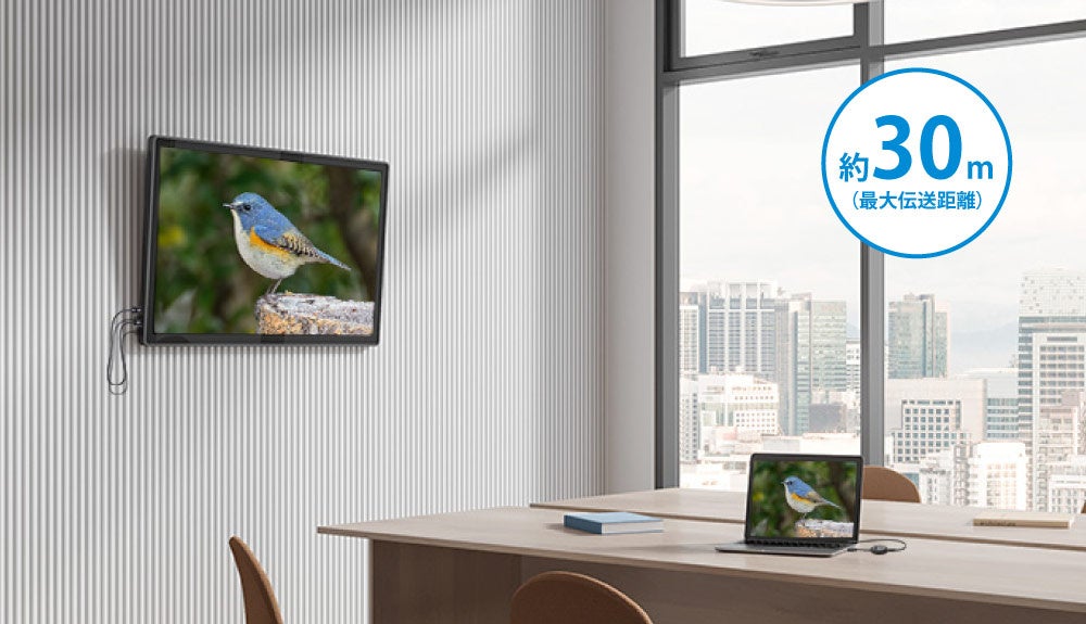 本製品は、離れた場所のテレビやディスプレイにも出力可能。広い会議室など、オフィスで自由な配置が可能です。