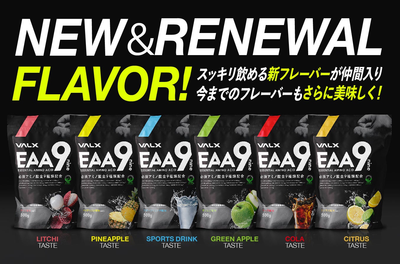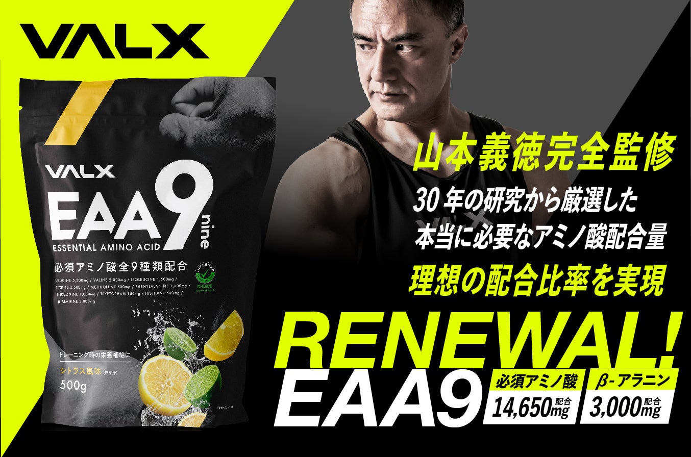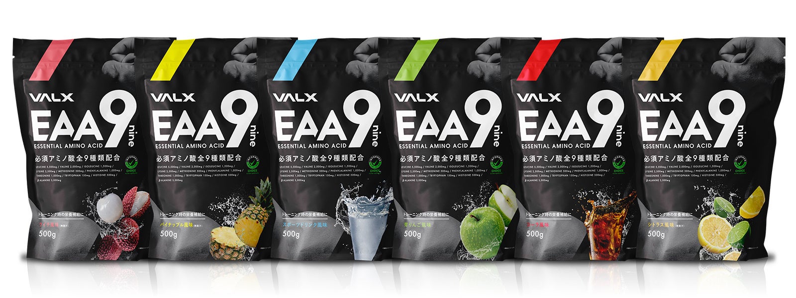 「VALX EAA9」とは、タンパク質を構成しているアミノ酸のうち、体内で生成することができない必須アミノ酸9種類を含んだサプリメントで、ワークアウトドリンクとして使用することをおすすめしている商品です。