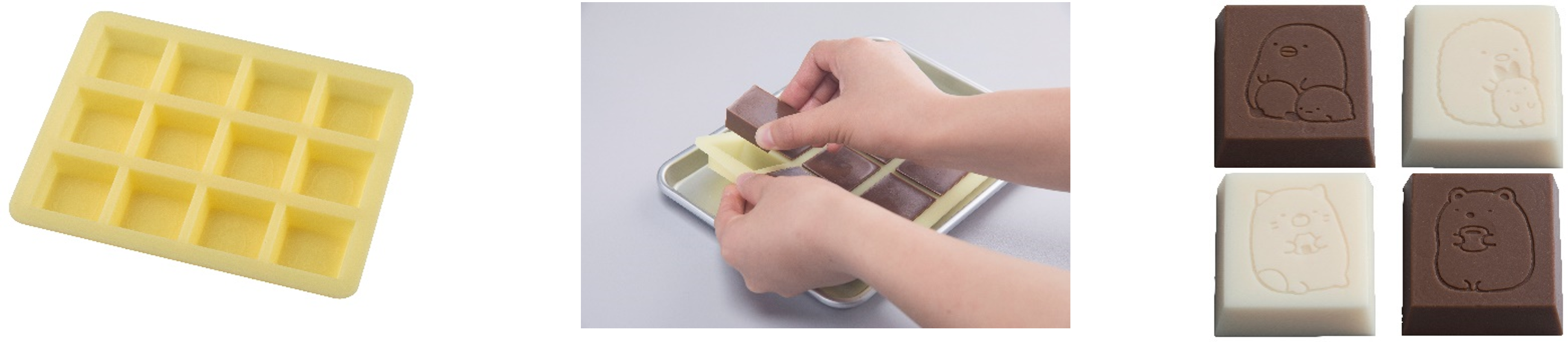 すみっコの模様が入った四角いチョコレートを一度に12個作ることができるシリコーン型です。中にナッツやドライフルーツを入れたり、ビスケットを重ねたり、2層チョコにしたりと、いろいろなアレンジが楽しめます。