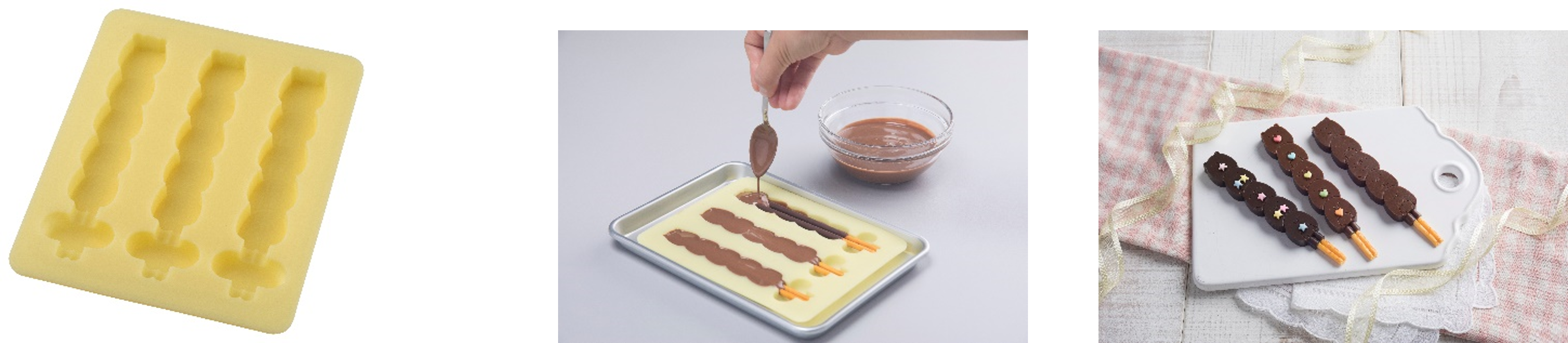 価格:935円(税込)市販のお菓子と組み合わせてスティックタイプのチョコレートが作れるシリコーン型です。手を汚さずに食べることができておやつにもぴったりです。アラザンやマジパンなどでデコレーションも楽しめます。