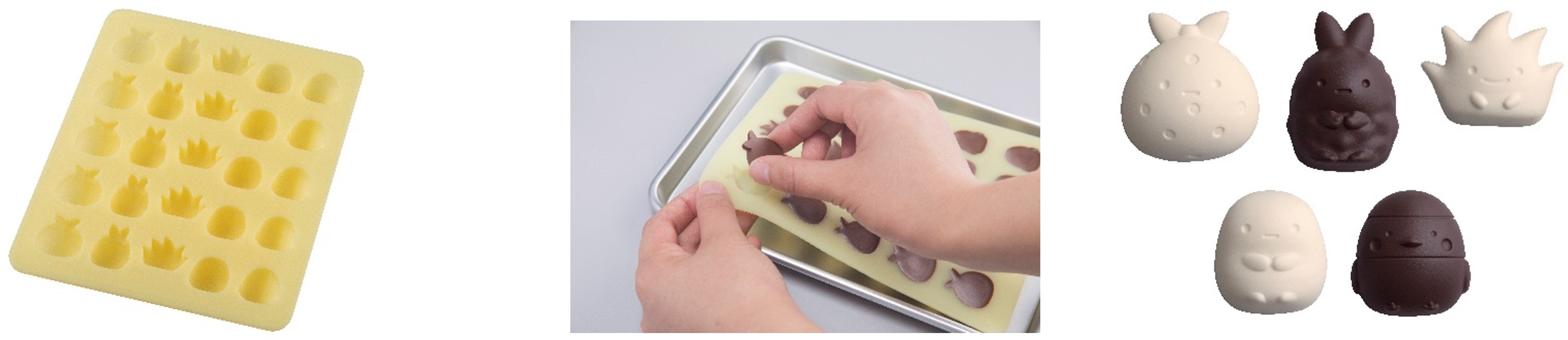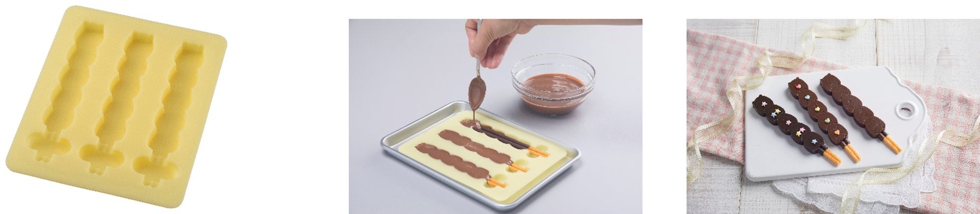 今回、2020年に発売し好評だった製菓シリーズ第1弾に続き、お菓子作りがもっと楽しくなる製菓シリーズ第2弾が新登場します。第2弾のラインナップでは、キャラクターのシルエットをしたチョコレート、模様の入ったチョコレートが作れるシリコーン製の型や、市販のお菓子と組み合わせて作ることのできるデコスティックチョコ型などを展開。