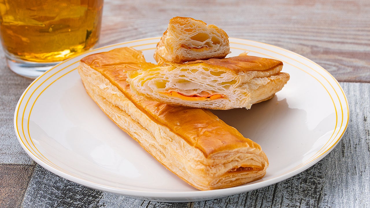 卵風味豊かなデニッシュ生地で、チェダーチーズ入りクリームを包みました。パンの甘さとチーズの塩味が相性抜群です。