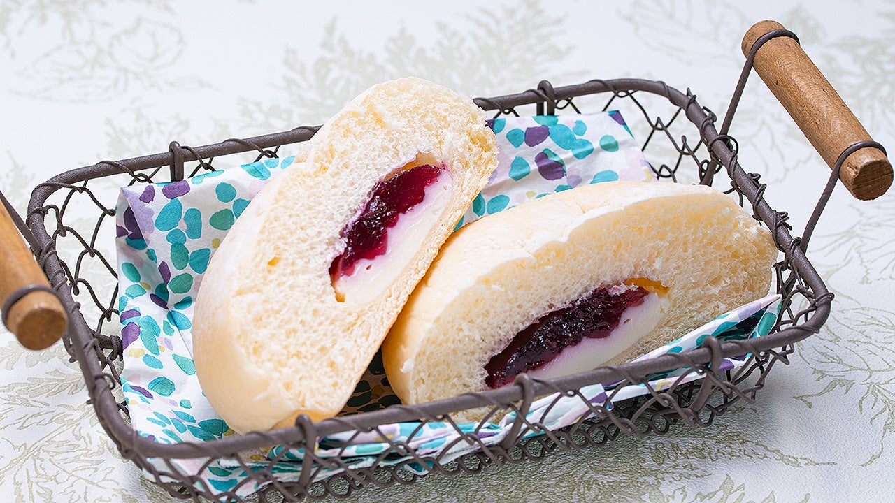 柔らかく白いパン生地にブルーベリージャムとレアチーズクリームを包みました。