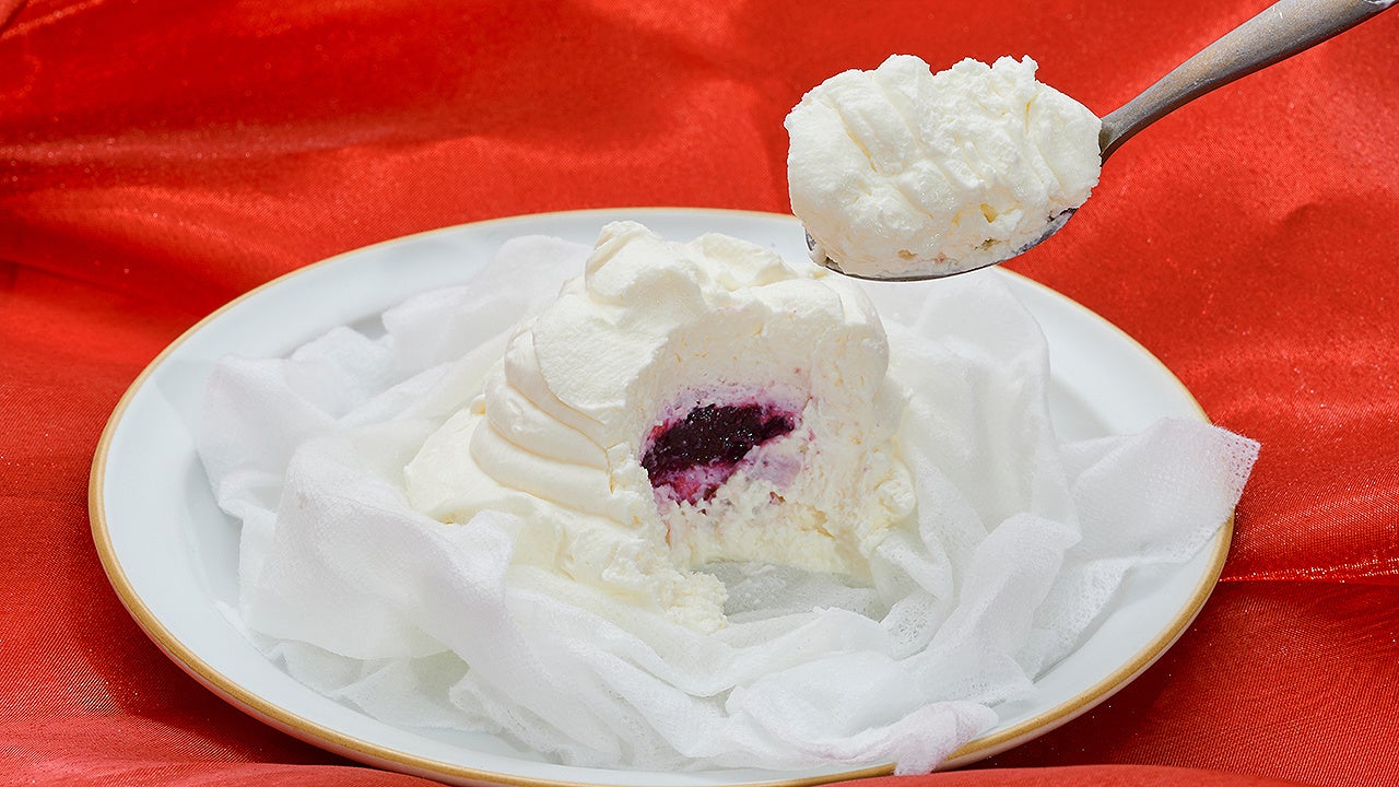 水切りするためガーゼにくるまれた状態で販売しており、中にふんわり甘酸っぱいチーズムースとブルーベリーピューレを使ったフルーティーなブルーベリーソースが入っています。