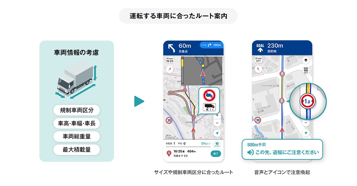 ~普通・準中型貨物自動車に対応。車両に合ったルート案内と地図表示で生活道路での安全運転を支援~