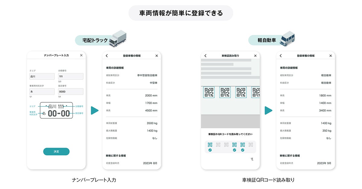 車両情報を考慮したルート案内を簡単にご利用いただけるよう、ナンバープレート情報の入力もしくは、スマートフォンのカメラで車検証の二次元バーコードを読み取るだけで、簡単に正確な車種情報(車両区分、車高、車幅、車両総重量、最大積載量など)を登録する機能も追加いたします。この車種情報をもとに、車両規制や車高・車幅・重量制限などを考慮したルート案内や地図表示が可能となります。
