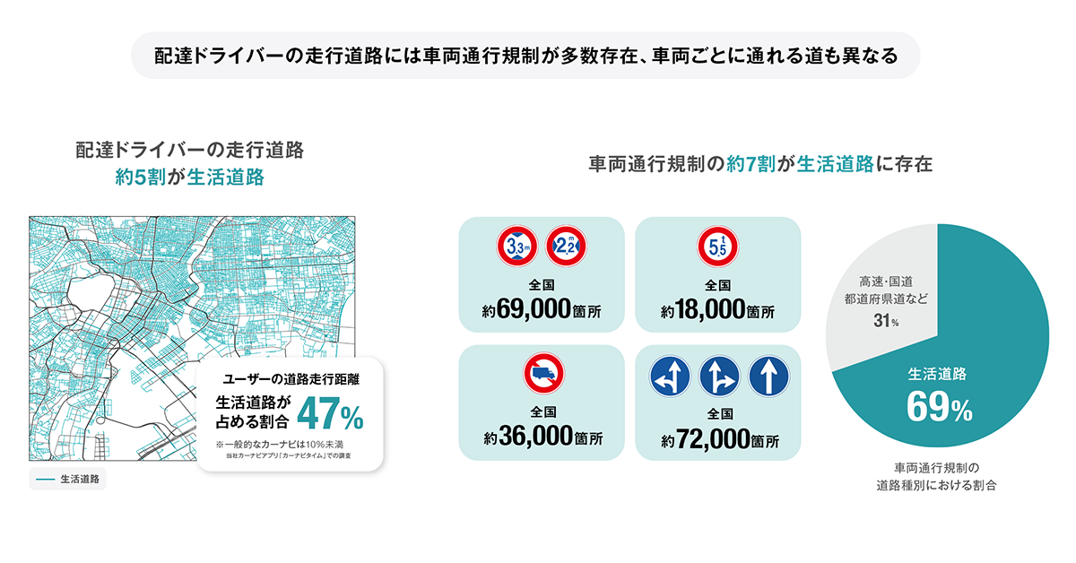 生活道路には高さ制限や最大幅規制、最大積載量の通行止めが多く存在していることから、車高・車幅・重量規制を考慮したルート案内や地図上のアイコン表示に対応することで、規制道路への誤進入防止や、細街路での安全運転をサポートできると考え、本対応を行いました。