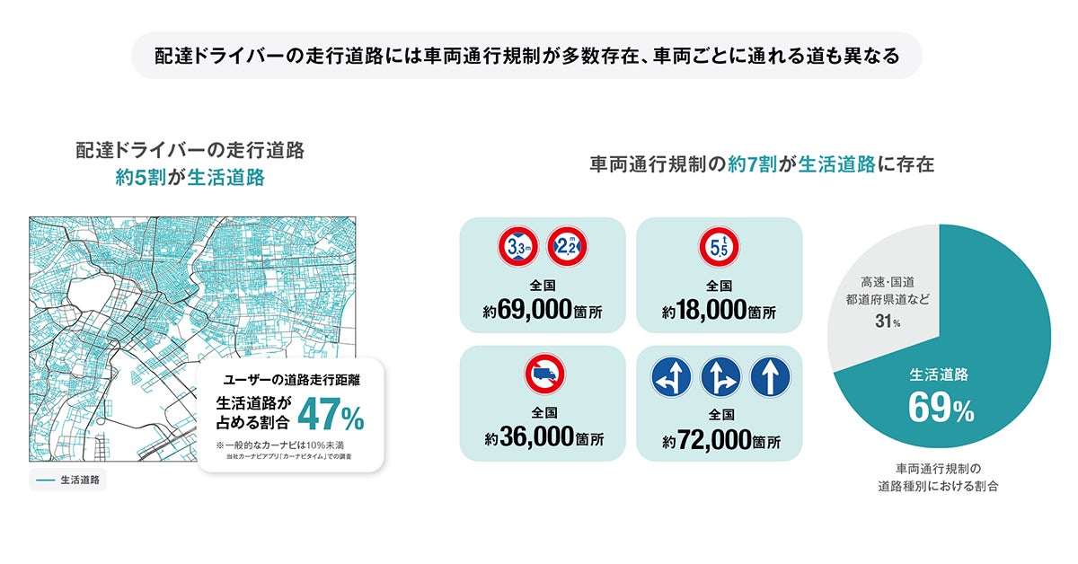 宅配においては、軽貨物車だけでなく、小型トラックでも道が狭く複雑な住宅街などの細街路を走行することが多く、道幅に余裕のない場所を通る必要があることを想定し、『配達NAVITIME』ユーザーの利用動向を分析した結果、住宅街などの生活道路の走行が半数を占めていることがわかりました。