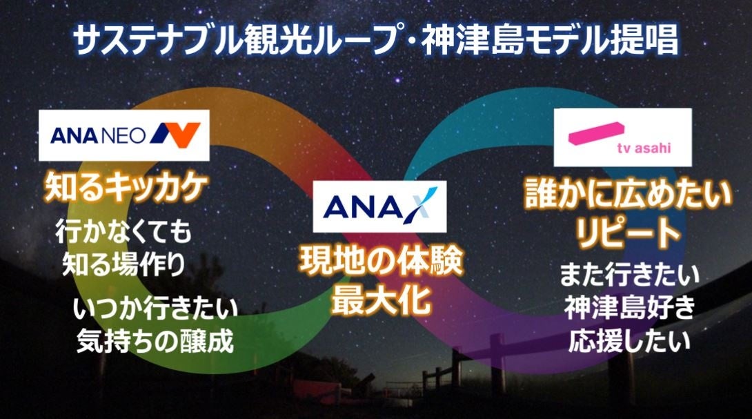 東京都 神津島村(村長:前田 弘、以下「神津島村」)は、「東京宝島 サステナブル・アイランド創造事業*1」において、東日本電信電話株式会社 東京西支店(支店長:上田 達、以下「NTT東日本」)、ANA NEO株式会社(代表取締役社長:冨田 光欧、以下「ANA NEO」)、ANA X株式会社(代表取締役社長:神田 真也、以下「ANA X」)、株式会社テレビ朝日(代表取締役社長:篠塚 浩、以下「テレビ朝日」)と連携し、観光分野において、新たな概念である「サステナブル観光ループ・神津島モデル」(以下「サステナブル観光ループ」、下記2項参照)を提唱、観光分野で新たに3つの取り組みを開始します。そして、今後もこのサステナブル観光ループを循環、発展させることで、持続的に神津島のファンを増やし、今後100年続く島の明るい未来への道筋を見出してまいります。