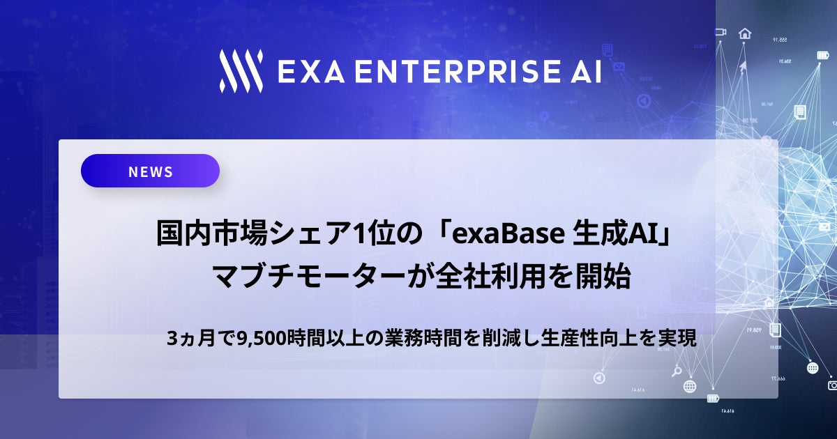 株式会社エクサウィザーズのグループ会社である株式会社Exa Enterprise AI(本社: 東京都港区、代表取締役: 大植 択真、以下Exa Enterprise AI )は、マブチモーター株式会社(本社:千葉県松戸市、代表取締役社長:高橋 徹、以下マブチモーター)が国内市場シェア1位を獲得した*2法人向け生成AIサービス「exaBase 生成AI」の国内拠点における全社的な利用を開始しましたので、お知らせいたします。Exa Enterprise AIは、日鉄ソリューションズ株式会社(以下NSSOL)と代理店契約を締結し、exaBase 生成AIの販売を促進してまいりました。この度の導入は、マブチモーターがNSSOLと連携して実現いたしました*3。