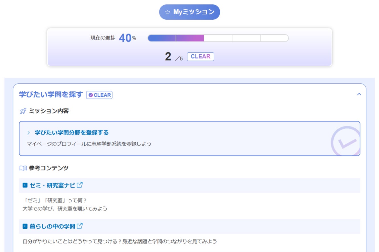 「何を学びたいか」「どんな大学があるのか」「入試の仕組みはどうなのか」といった志望校選択のプロセスをミッション形式で順を追って進められるツールです。