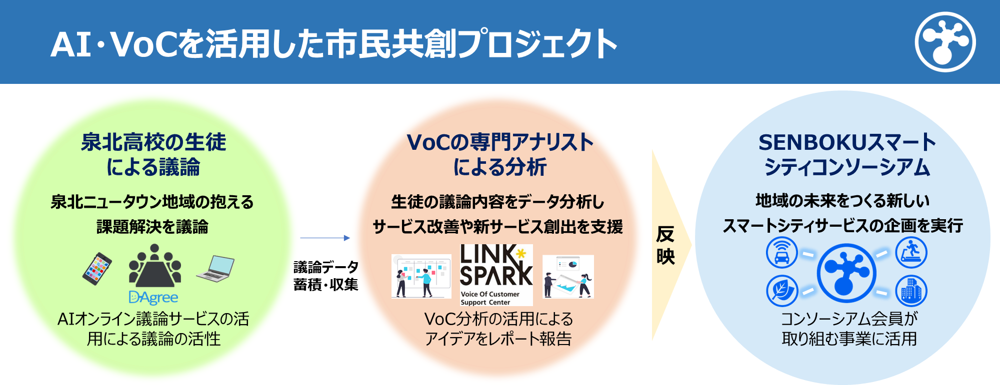 泉北ニュータウン地域では、SENBOKUスマートシティコンソーシアムの会員とともに様々な分野でのスマートシティの取組を行っていますが、取組には「市民と共に創る」という視点で、市民の声(「Voice of Citizen」以下、「VoC」)を収集・分析しコンソーシアム会員が取り組む事業に活用する仕組の構築が重要です。