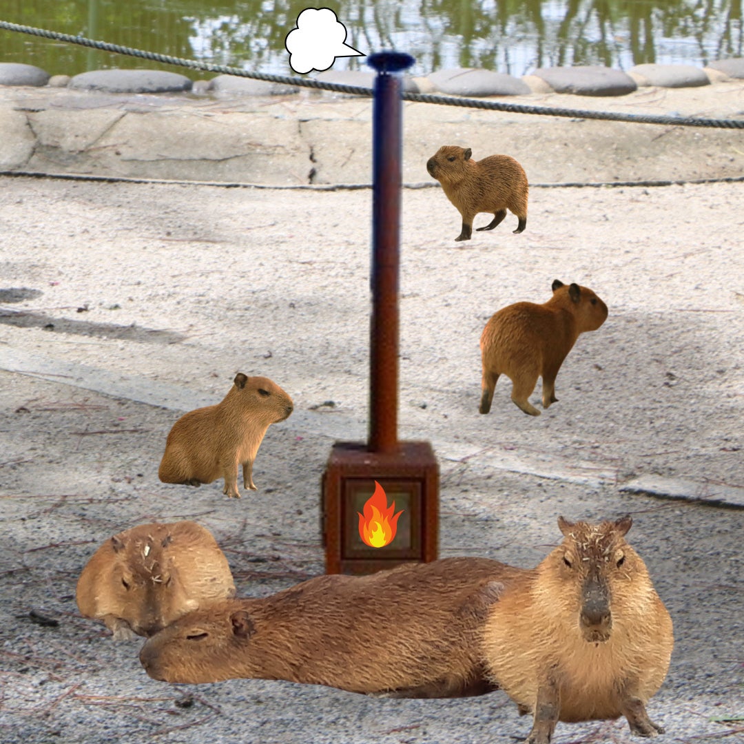 このイベントは、本来の生息地は暖かい地域ですが、日本の寒い冬でも頑張ってくれているカピバラ(南米原産)に「ウッドストーブ」、カンガルー(オーストラリア原産)に「特製こたつ」を用意して、ゆっくりまったり暖まってもらいます。
