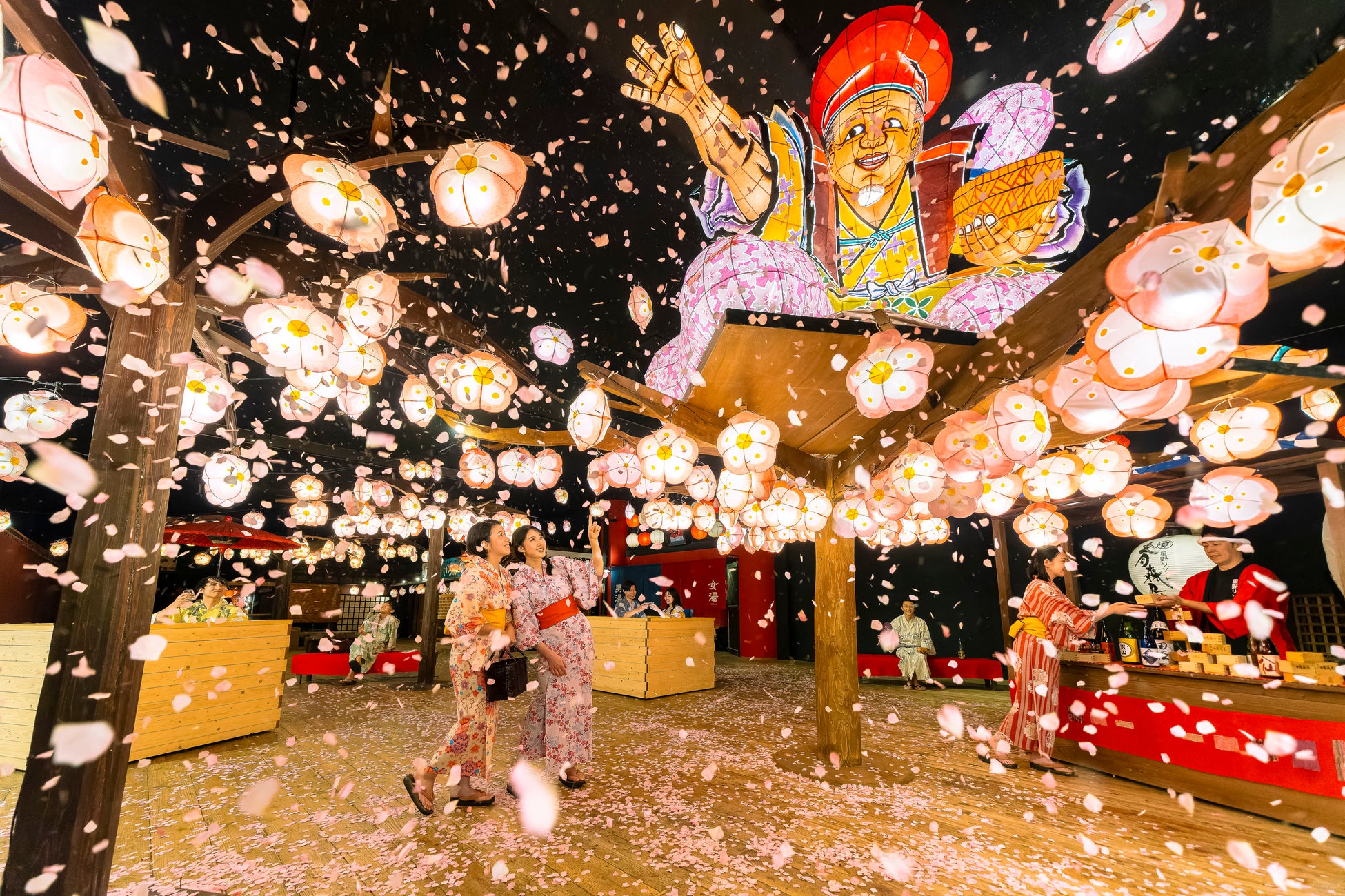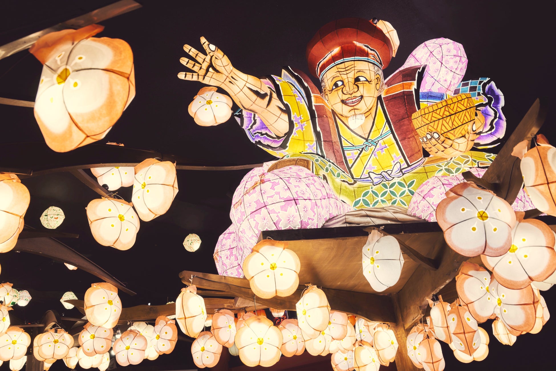 青森屋の中心に位置する「じゃわめぐ広場」の中央に佇む大きなりんごの木の上には、イベントのシンボル「ねぶた花咲かじいさん」がゲストと共に春の訪れを祝います。広場内には花咲かじいさんが咲かせた約200個のりんごの花型灯篭が咲き、花見気分を楽しめます。
