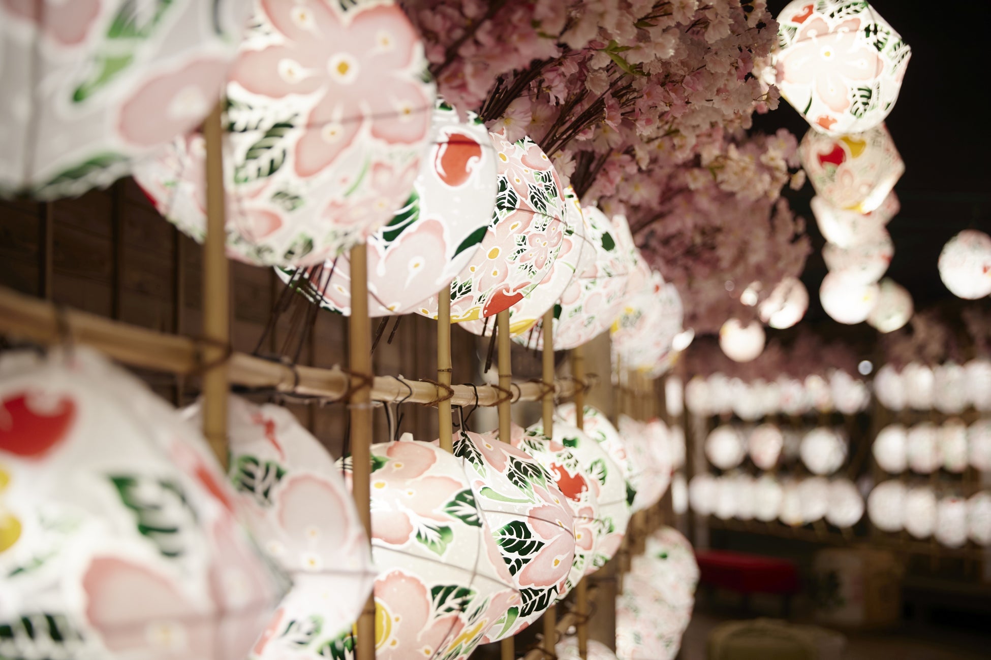 館内の通路は300個以上のりんごの花が描かれた灯篭と桜で飾られ、館内を移動するときも花見気分を味わうことができます。友人や家族と、春の思い出の記念写真におすすめの撮影スポットです。