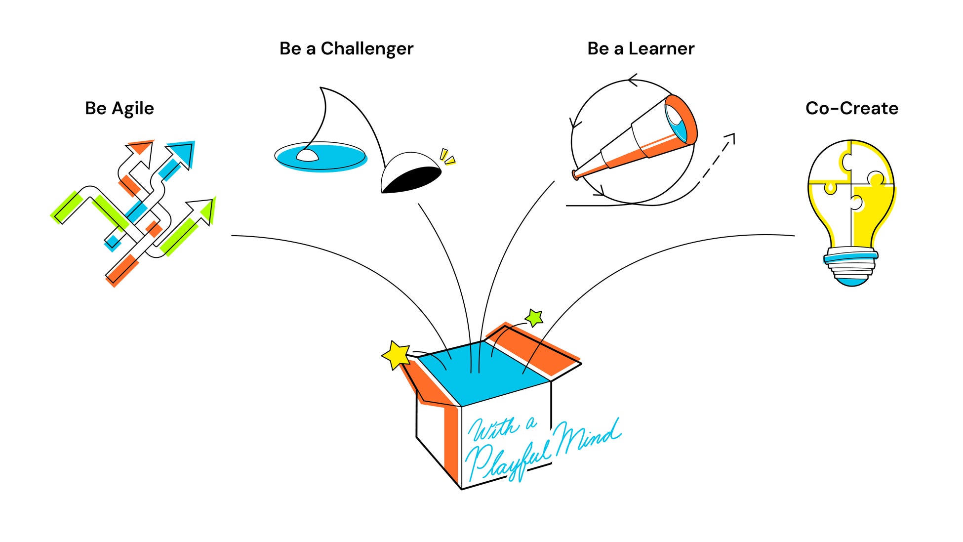 新たな四つのバリュー「Be Agile(アジャイルであれ)」「Be a Challenger(挑戦者であれ)」「Be a Learner(自ら学びつづけよう)」「Co-Create(共創しよう)」に加え、その根幹にあるマインドセットとして「With a Playful Mind(あそび心を忘れずに)」を組織の意思決定や行動の軸として、更なる飛躍を目指してまいります。