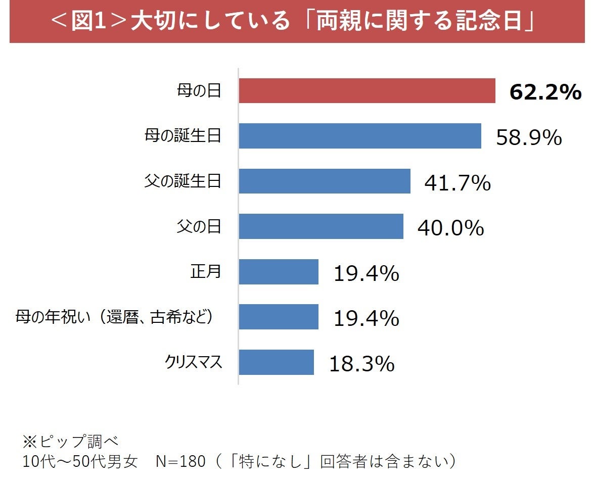 ✓ 「両親に関する記念日」の中で、母の日を大切にしている方は62.2%。