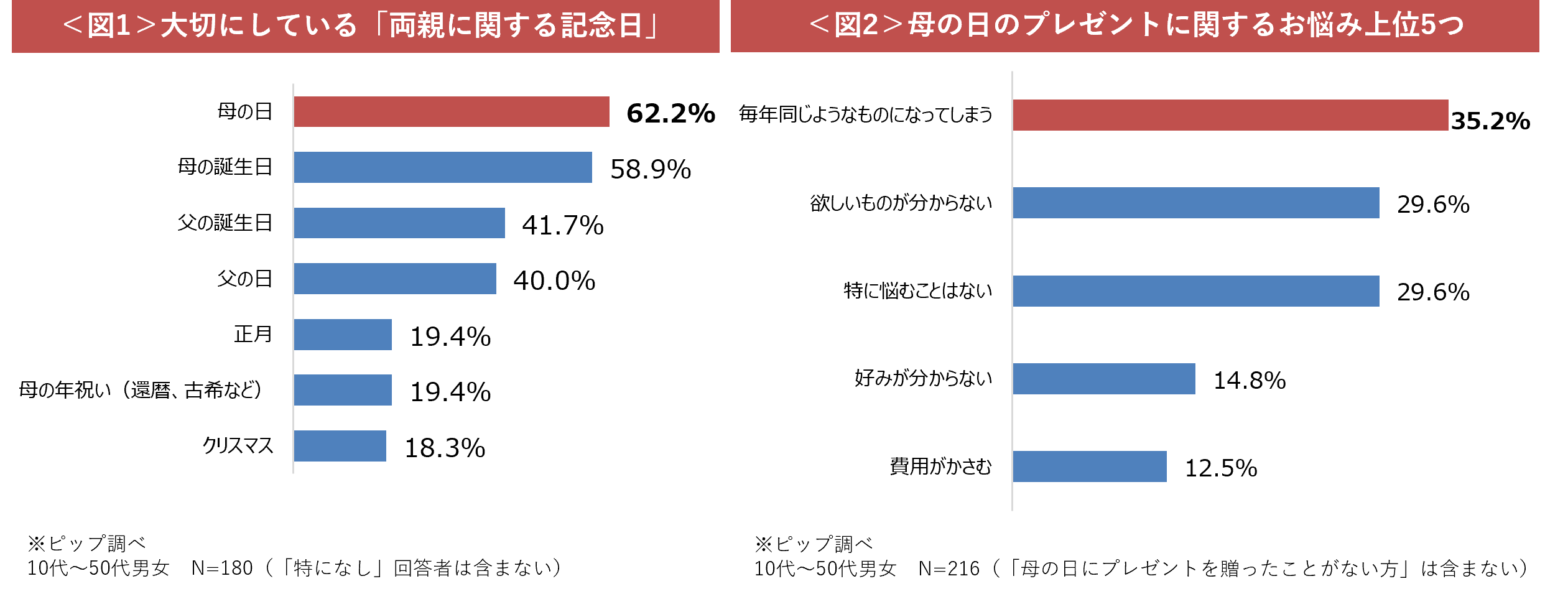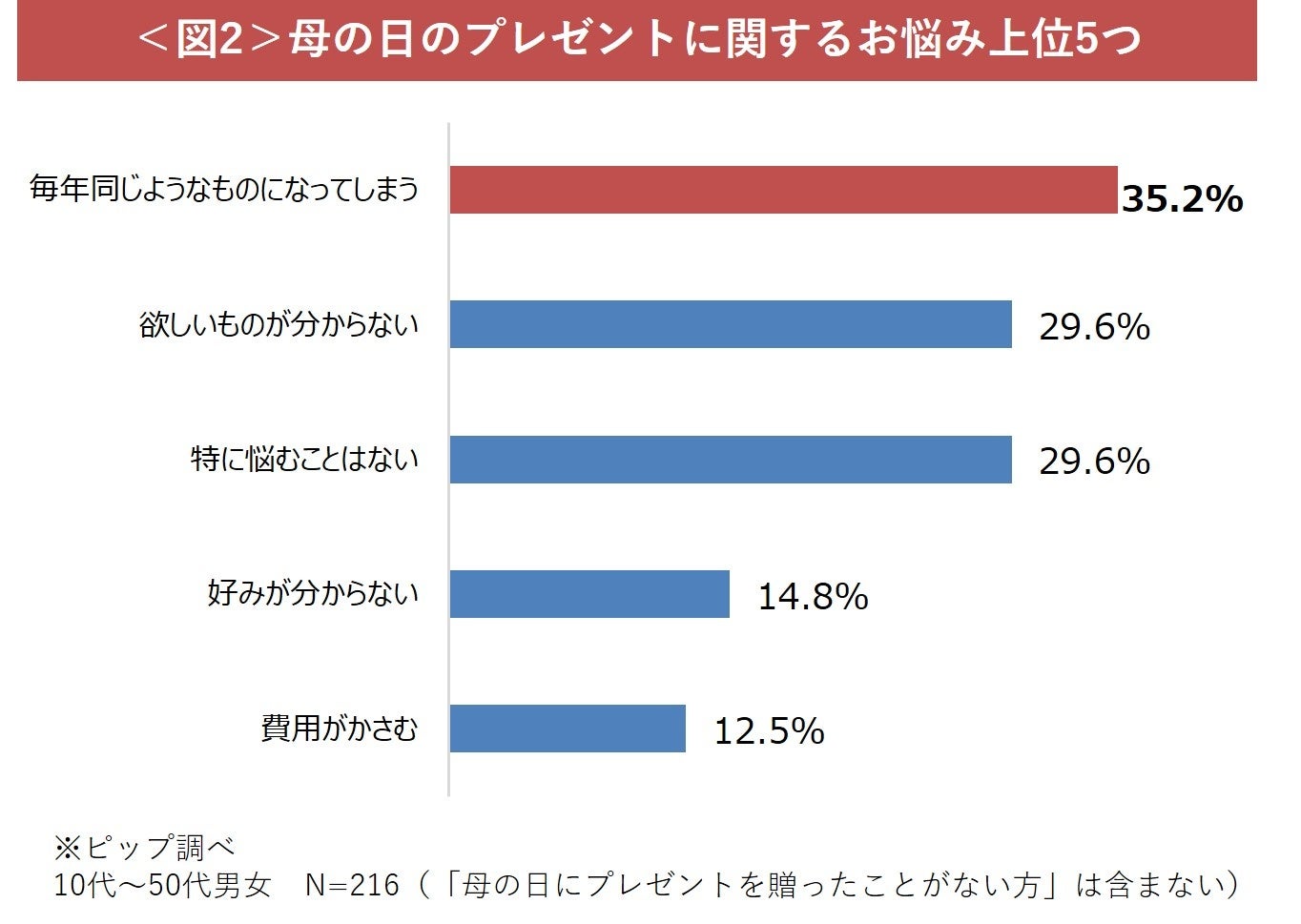 日頃からお世話になっているお母さんへ感謝を伝える母の日。ピップの調査では、大切にしている「両親に関する記念日」として、母の日を大切にしていると答えた方は62.2%いることが判明しました<図1>。そんな中で、毎年選ぶ母の日プレゼントにレパートリーが尽き、悩んでいると回答した方は35.2%に上っています<図2>。その他、欲しいものや好みがわからないという方も多く、プレゼント選びに頭を悩ませていることがわかりました。