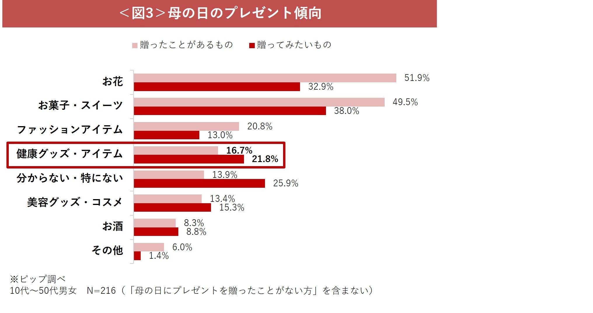 母の日のプレゼントは、多くの方がお花やお菓子、スイーツを選んでいる傾向がある中で、実は健康のためのアイテムを贈ってみたいと考えている人も一定数いることがわかりました<図3> 。毎日忙しく頑張っているお母さんに健康アイテムのプレゼントを贈ることで、感謝の気持ちと身体を労わる想いが伝わります。