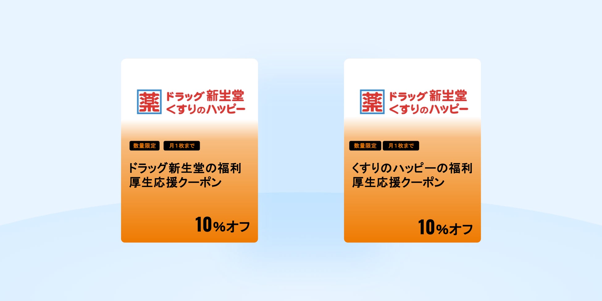 「ドラッグ新生堂」「くすりのハッピー」でご利用頂ける、お会計10%OFFの優待です。