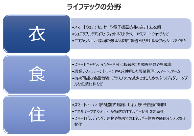 LifeTech(ライフテック)とは、Life(生活)とTechnology(技術)を組み合わせた言葉で、生活全般に関連する技術やソリューションの総称です。これは、日常生活の質を向上させるためのテクノロジーを中心に考えられたコンセプトであり、具体的には健康、住まい、食、衣服、レジャー、エンターテインメントなど、私たちの日常生活のあらゆる側面に関連する技術や製品を指します。