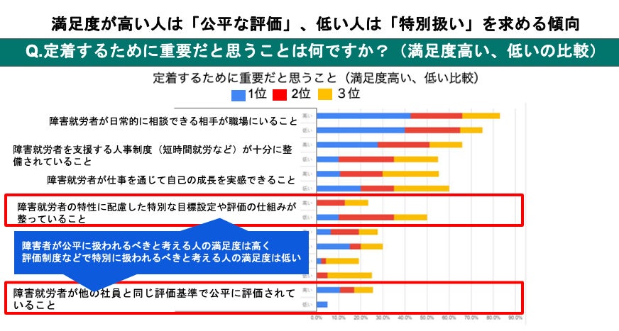 労満足度を比較した結果、満足度が高い人は「職務や評価の公平性」を重視する傾向にあるのに対し、満足度が低い人は「自分への特別扱い」を求める傾向が見られました。 このことから、「公平な評価とフィードバックの仕組み」こそが、就労者の自律と成長を促し、結果的に満足度と定着率を高めることが示唆されます。