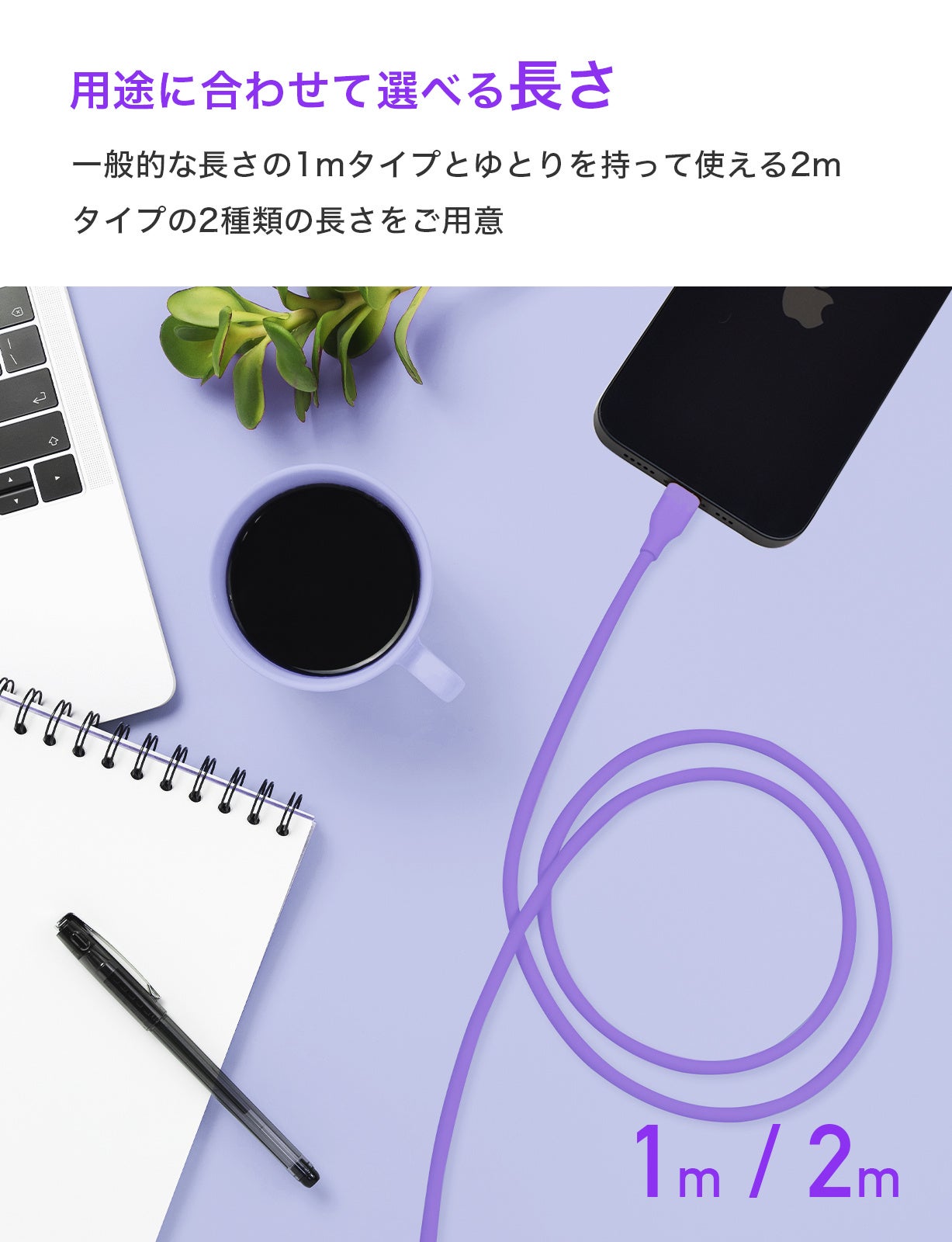 急速充電PD対応・30000回の折り曲げテストをクリアした高耐久仕様・長さは選べる2種類(1m / 2m)
