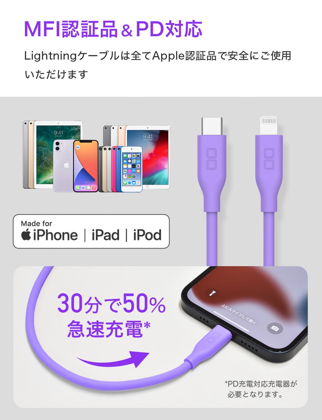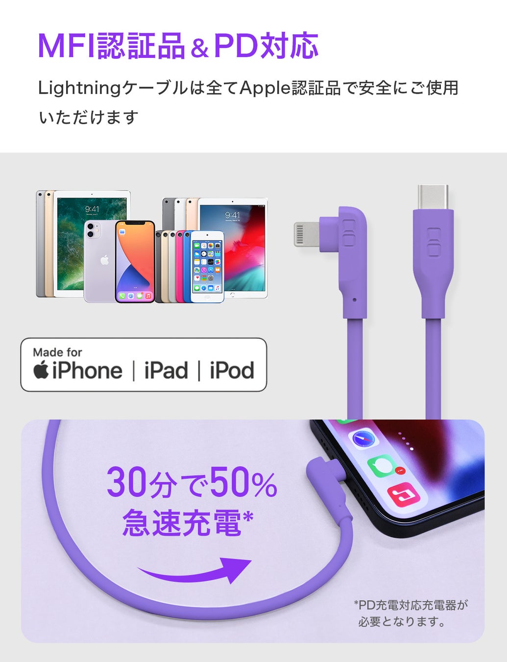 iPhone8以降、iPad/iPadPro(一部機種)の急速充電に対応。20W充電にも対応しているためPD対応アダプタとの組み合わせで30分で約50%の充電が可能です。