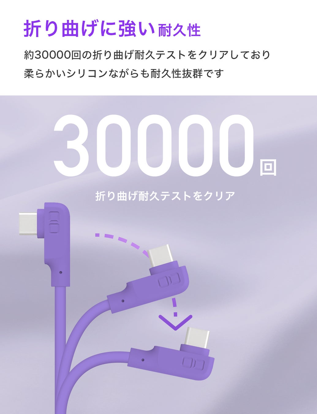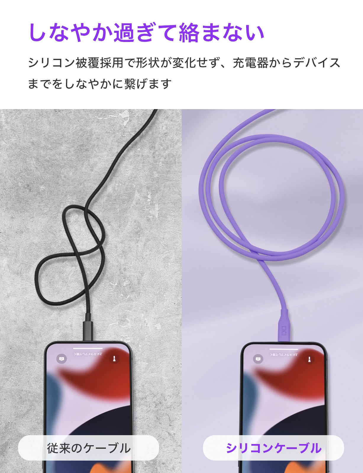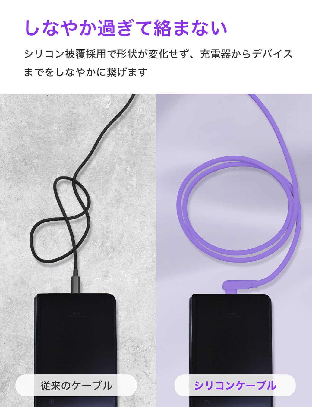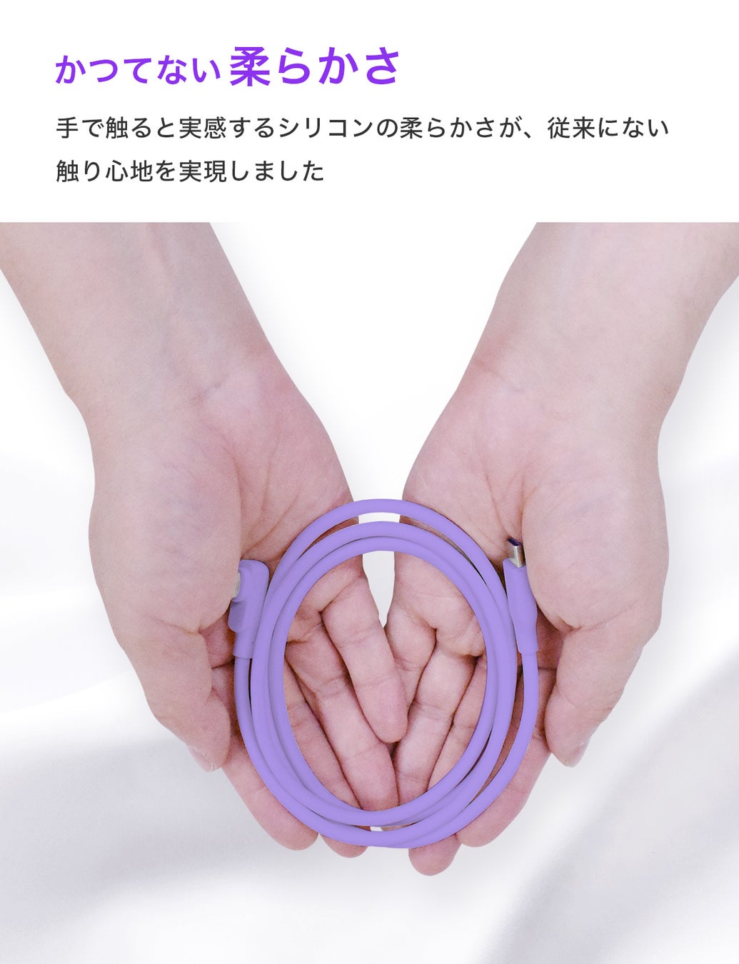 高耐久・心地のよい肌触り・しなやかで絡みにくく、ストレートコネクタとL字型コネクタを採用した急速充電対応USBシリコンケーブルに新色「パープル」が新登場!