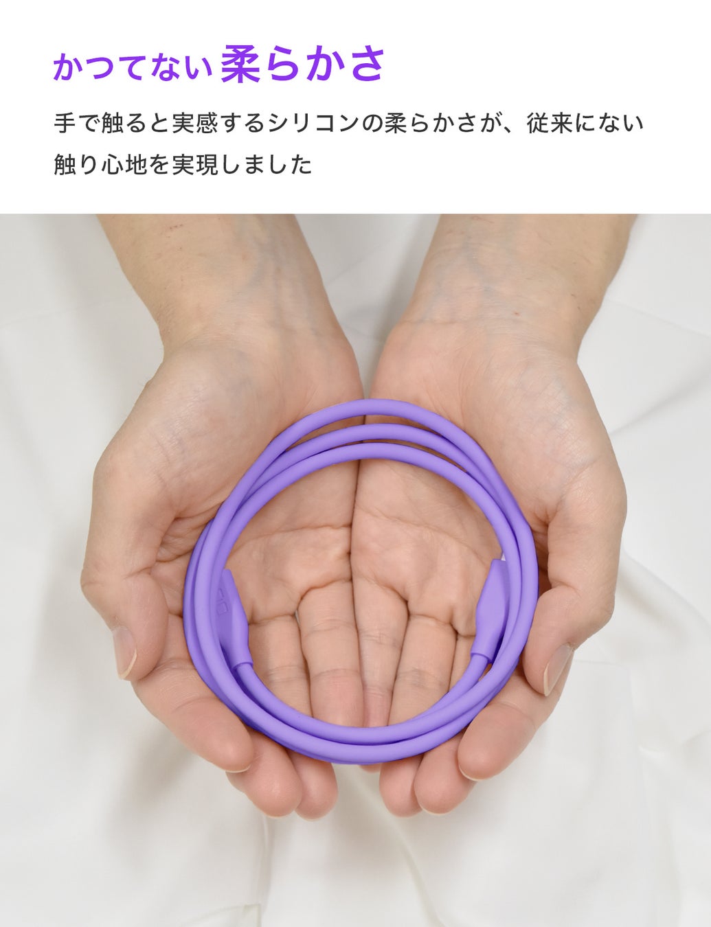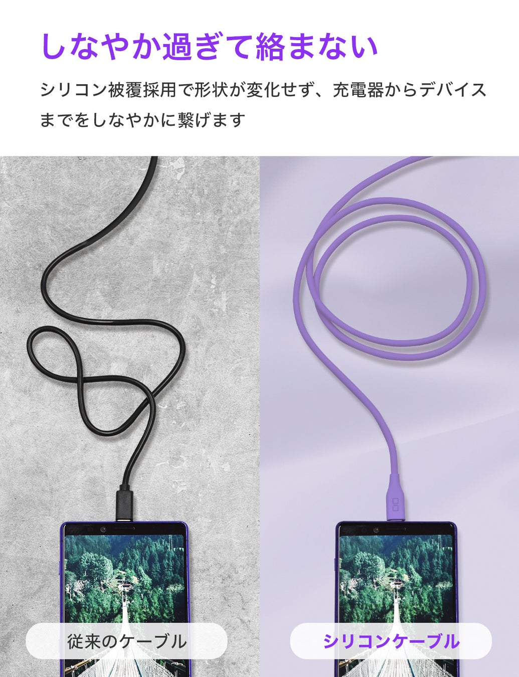 ケーブル被覆に柔軟性のあるシリコン素材を採用。しなやかで絡みづらいので使い心地・収納性にも優れます。心地よい肌触りで癖がつきにくいので、各デバイスの充電時ケーブルの取り回しに便利です。