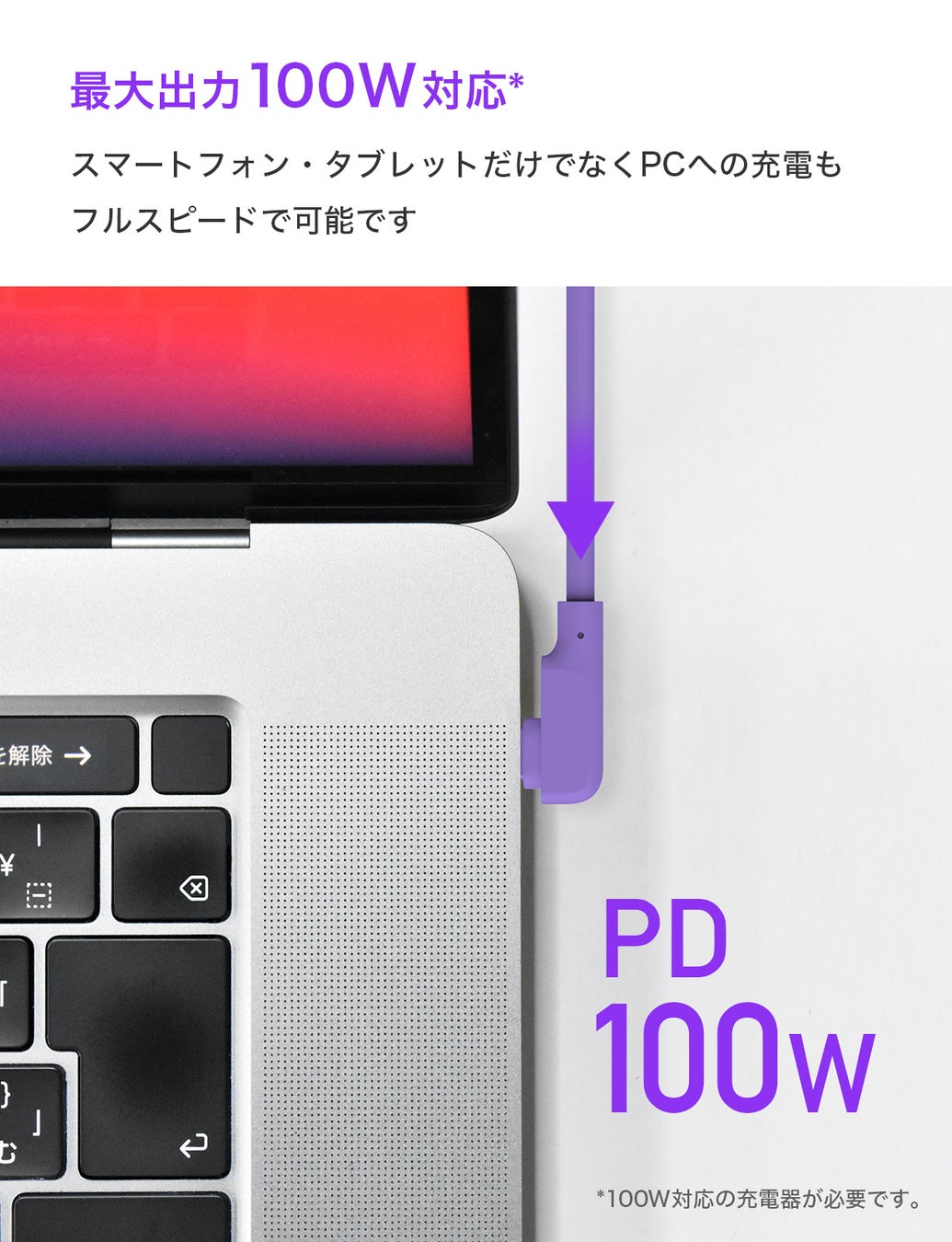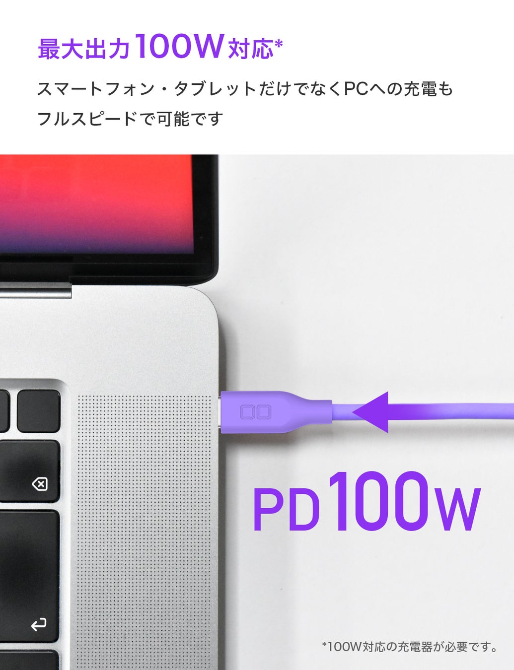 USB-C to USB-Cケーブルは最大100WのPD充電に対応。スマートフォンのみならずPD対応パソコンやタブレットなどでもご使用いただけます。